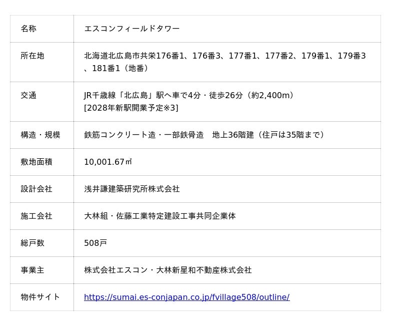 株式会社エスコン(本社:東京都港区、代表取締役社長:伊藤貴俊)は、大林新星和不動産株式会社(本社:東京都港区、代表取締役社長:矢野忠賢)と共同で手がける、分譲タワーレジデンス『エスコンフィールドタワー』の公式ホームページを本日公開し、エントリーの受付を開始しましたのでお知らせいたします。当物件は、北海道日本ハムファイターズのホーム球場である「ES CON FIELD HOKKAIDO」が位置する北海道ボールパークFビレッジ(以下「Fビレッジ」)のエリア内※1において最高層となる、35階※2、総戸数508戸を誇るタワーレジデンスです。2028年夏頃開業予定※3のJR千歳線新駅(以下「新駅」)から約200mの場所に誕生します。
