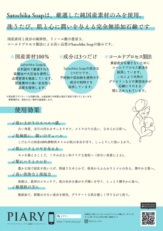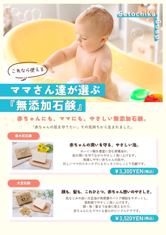 また、きらきらフェスタ事務局が2026年3月22日に愛知県名古屋市で開催する「Baby マタニティ&育児フェスタ」のピアリー社ブースにて、「Satochika Soap(サトチカソープ)」のサンプル配布を実施いたします。