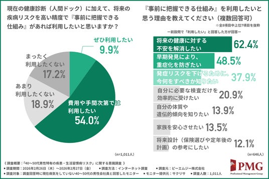 「現在の健康診断(人間ドック)に加えて、将来の疾病リスクを高い精度で『事前に把握できる仕組み』があれば利用したいと思うか」と尋ねたところ、約6割が『ぜひ利用したい(9.9%)』『費用や手間次第では利用したい(54.0%)』と回答しました。
