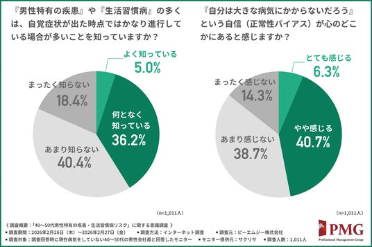 「『男性特有の疾患』や『生活習慣病』の多くは、自覚症状が出た時点ではかなり進行している場合が多いことを知っているか」と尋ねたところ、約4割が『よく知っている(5.0%)』『何となく知っている(36.2%)』と回答しました。
