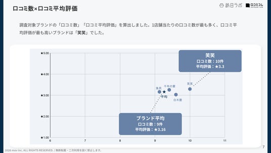 調査対象ブランドの「口コミ数」「口コミ平均評価」を算出しました。1店舗当たりの口コミ数が最も多く、口コミ平均評価が最も高いブランドは「笑笑」でした。