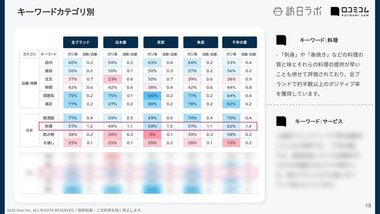 キーワード「料理」「サービス」での各ブランドの評価