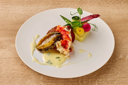 「オマール海老と鮑 柑橘風味のバターソース お野菜のブーケを添えて」