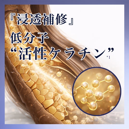 カラー・ブリーチ毛などのダメージでパサつきやすい髪へ、低分子”活性ケラチン”*¹を主軸に、ヘマチン*²、中分子のケラチン*¹¹、加水分解シルク*¹²、γ-ドコサラクトン*¹³などの補修成分を配合。