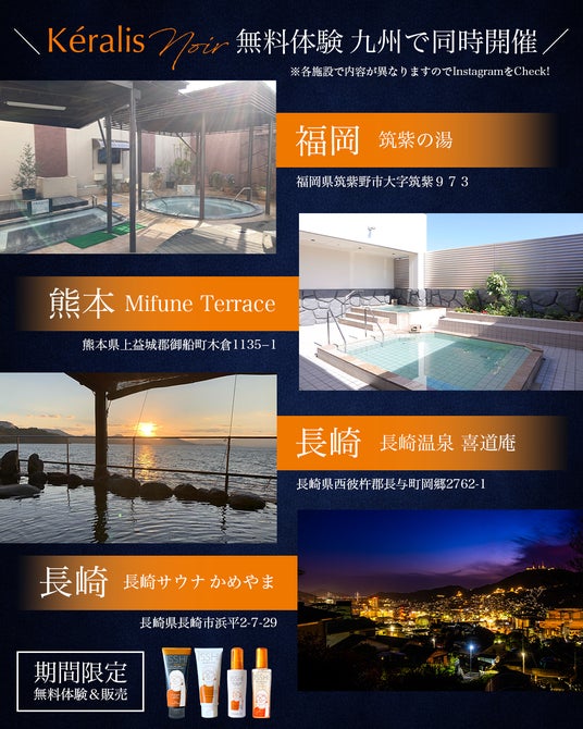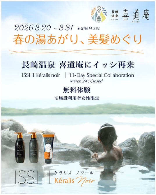 九州温浴施設にて、期間限定の無料でお試し体験も。新商品のISSHI Keralis noirシリーズに加え、ISSHIシリーズの大人気ヘアミルクやLDKでA評価(アイロン前に使えるオイル部門)を獲得した、ヘアキープオイルも無料でご体験いただけます。