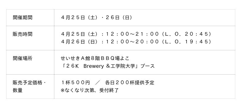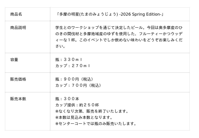 多摩大学松本ゼミの活動拠点の1つである奥多摩の魅力を詰め込んだオリジナルのクラフトビールを、武蔵野市にある「26K Brewery」の醸造所と共同開発。原材料の一部には明星大学が京王聖蹟桜ヶ丘ショッピングセンター屋上で育成&収穫した生ホップを使用。奥多摩産のひのきの間伐材と多摩地域産のゆずを使用した、2つの素材の魅力をギュッと閉じ込めた、渾身の1杯「多摩の明星 -2026 Spring Edition-」をお楽しみ頂けます。