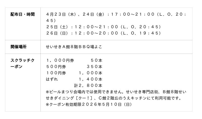 ブルワリー店舗でのお買い上げ1会計700円(税込・合算不可)毎に、せいせき専門店街で使用できるスクラッチクーポンを1枚、各店各日先着50枚を進呈いたします。
