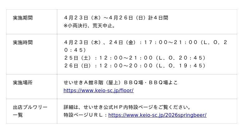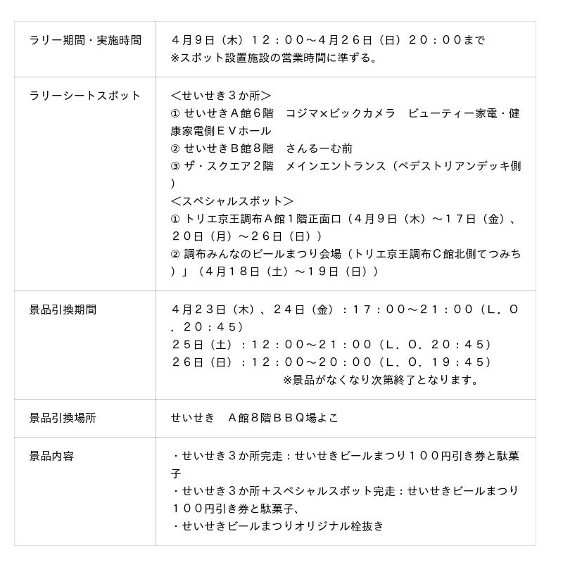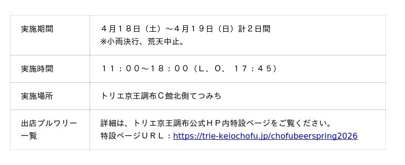 株式会社京王SCクリエイション(本社:東京都渋谷区 、代表取締役社長:小堺 健司)は、2026年4月18日(土)から4月19日(日)の2日間、トリエ京王調布C館北側てつみちにて「調布みんなのビールまつり」を実施します。また、翌週の4月23日(木)から4月26日(日)の4日間、京王聖蹟桜ヶ丘ショッピングセンター(以下、せいせき)にて「せいせき春のビールまつり」を開催します。両イベントは「調布駅」、「聖蹟桜ヶ丘駅」の2駅間の人的交流を目的としており、相互送客をすることで沿線のまちの魅力を発見してもらう狙いがあります。また、両イベントで使用できるビール共通回数券販売やお得にビールが飲める割引券等が当る企画など、ご家族や友人とお楽しみいただけるイベントになっております。さらに、京王トレインポイント会員を対象に、ビールまつり当日、調布駅または聖蹟桜ヶ丘駅の自動改札を出場し、ビールまつり会場でビール共通回数券を購入、会場内専用二次元コードを読み込んだ方全員に、京王トレインポイント200ポイントをプレゼントします。この機会に京王線に乗って両ビールまつりに参加しましょう。
