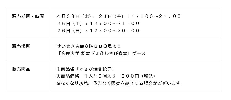 多摩大学松本ゼミとわさび食堂が共同開発!奥多摩産わさびの魅力と味わいとギュッと詰め込んだオリジナルの「わさび焼き餃子」を本イベント限定で販売します。今回は東京都八王子市の株式会社ワタナベ食品に製造を依頼し、多摩地域での製造を実現しました。