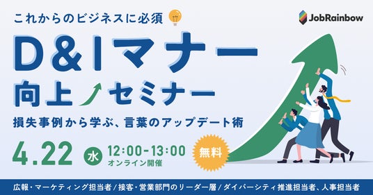 株式会社JobRainbow(本社:東京都千代田区、代表取締役:星賢人)は、2026年4月22日(水)12:00~13:00に、オンラインセミナー「これからのビジネスに必須 D&Iマナー向上セミナー~損失事例から学ぶ、言葉のアップデート術~」を開催いたします。
