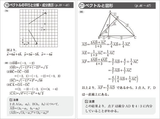 取り外せる別冊解答では、自学自習でも使いやすいように、ていねいに計算過程や答えの導き方を示しました。「注意」として間違えやすいポイントや参考事項も紹介しています。