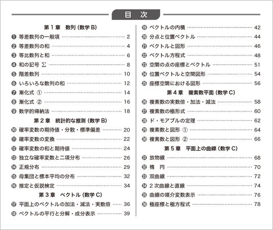 大学入学共通テストでは「数学B」「数学C」の4項目から3項目を選択します。本書は出題範囲をすべてカバーしており、共通テストに向けた土台づくりにも活用できます。