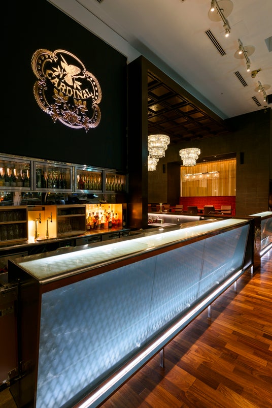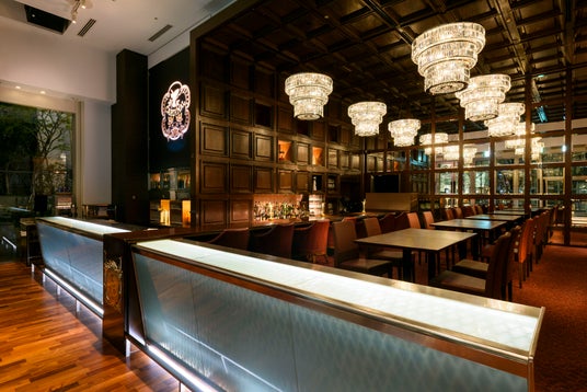 スワロフスキー製クリスタルピースのシャンデリアが輝くラグジュアリーなラウンジ(写真奥)と、キャッシュオンデリバリーで気軽に楽しめるスタンディングバーゾーン(写真手前)。二つのスタイルが共存する空間。