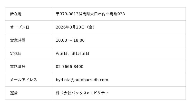 BYDの日本法人であるBYD Auto Japan株式会社(本社:神奈川県横浜市、代表取締役社長:東福寺 厚樹、略称:BAJ)の正規ディーラーである株式会社バックスeモビリティ(*1)(本社:東京都練馬区、代表取締役社長:三田 真之)は、2026年3月20日(金)に、群馬県第2店舗となるショールームを備えた正規ディーラー店舗「BYD AUTO 太田」をオープンします。