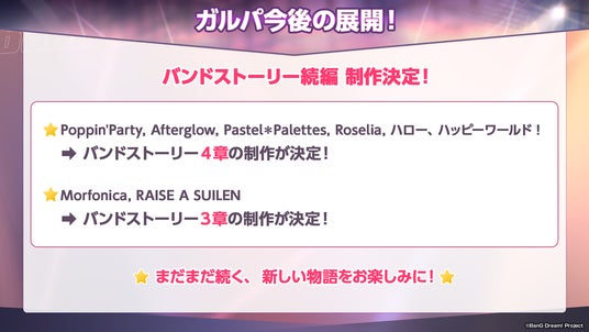 Poppin'Party・Afterglow・Pastel*Palettes・Roselia・ハロー、ハッピーワールド!はバンドストーリー4章、Morfonica・RAISE A SUILENはバンドストーリー3章を制作いたします。