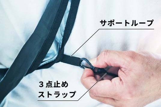 ズレを防ぐ「3点止めストラップ」ショルダーベルトにもうけたサポートループがバッグの位置を安定させます。