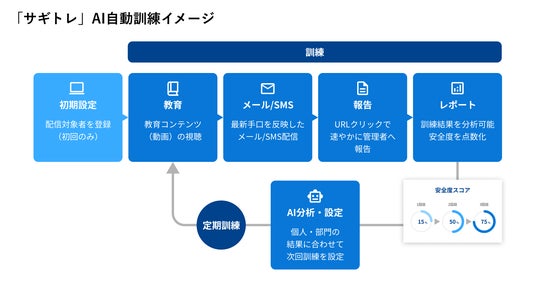 「サギトレ」は、法人におけるセキュリティ教育やリスクへの対応力向上を目指した、詐欺メール・SMS訓練サービスです。ユーザー企業の従業員は、「サギトレ」のシステム上で詐欺の手口や注意すべきポイントを学ぶ教育コンテンツを視聴し、その後、実際の業務環境の中で疑似的な詐欺メール・SMSを受信します。AIがその対応結果を分析し、個人や部門ごとのリスク傾向を可視化。分析結果に基づき、最適な訓練内容や配信スケジュールを自動で設定します。