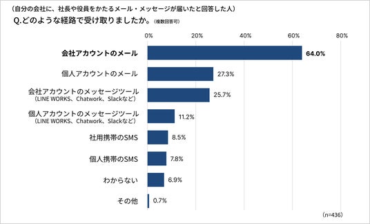 ◯ニセ社長詐欺の主な受信経路は「会社アカウントのメール」