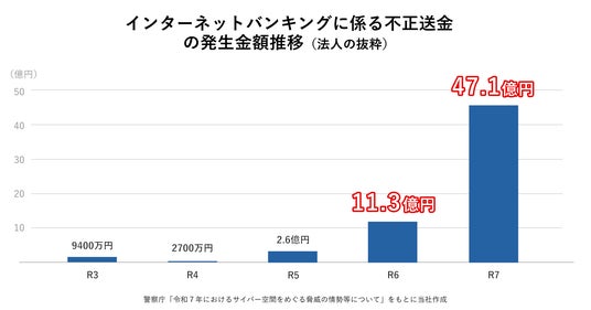 警察庁サイバー警察局の発表によると、令和7年の法人におけるインターネットバンキングの不正送金被害額は47億円で、前年の約4倍に増加しています。