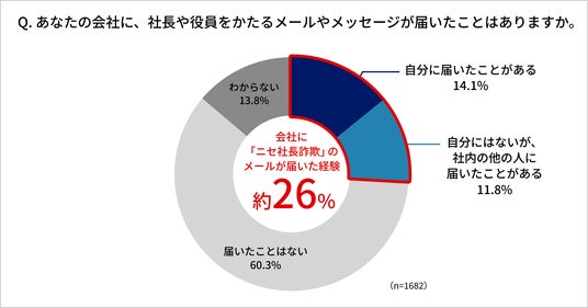 「あなたの会社に、社長や役員をかたるメールやメッセージが届いたことがあるか」と質問したところ、「自分に届いたことがある」は14.1%、「自分にはないが、社内の他の人に届いたことがある」が11.8%で、4人に1人(合計25.9%)の会社員が、自身や周囲で「ニセ社長詐欺」のメールが届いた経験があることがわかりました。