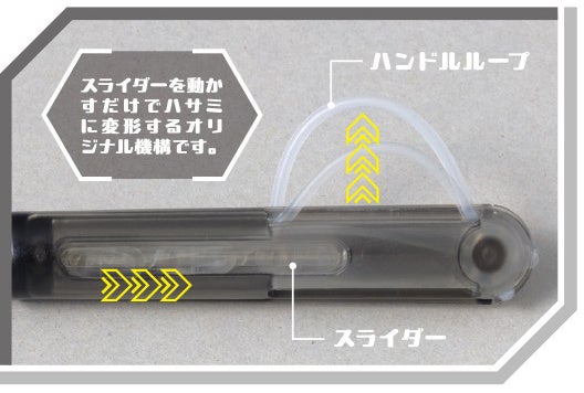 スライダーを動かすだけでハサミに変形するオリジナル機構。