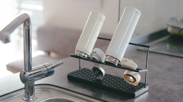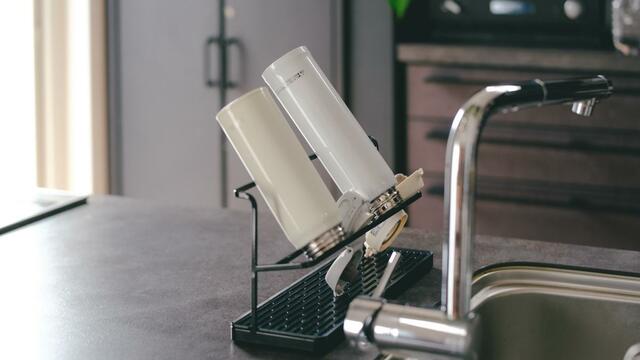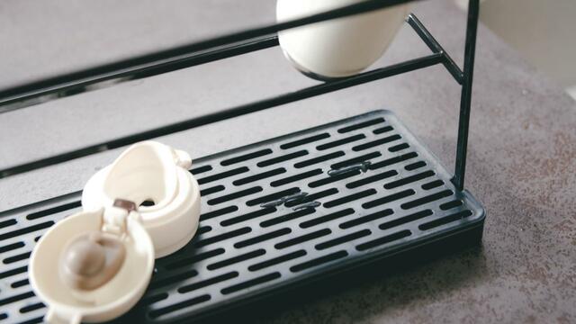 下の部分は水切りできるトレーになっており、細かいパーツもボトルを乾かしながらまとめて置けるので、夜に洗って朝使うときに「どこいった?」と探すことがなくなったんです。