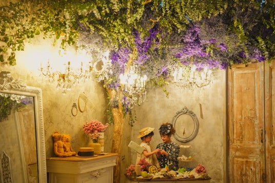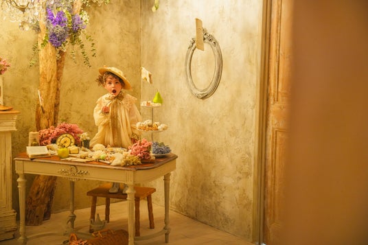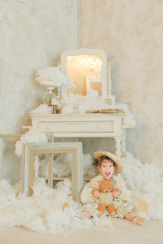 雲の上のアンティークをイメージした「Cloud Room-雲の上の部屋-」は、唯一無二の世界観でファンの多いフォトグラファーMizukiが手がけた撮影空間。ドレッサーの前で子どもたちが遊びはじめると、鳥籠の中からふわふわと雲がこぼれてきます。雲の上で寝転がったり、鏡をのぞいたり、くすっと笑ったり、そんな特別な時間がこの場所をやさしい空の物語にしてくれます。藤沢・湘南台店限定の特別なセットです。