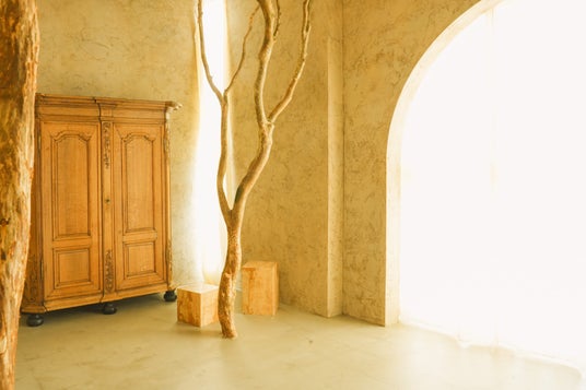 2本の木と、大きな棚がアンティークの棚が象徴的な空間。全体的に暖色で、温かみのある写真が撮れます。