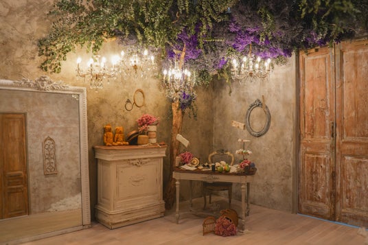 花の天井と多くのアンティークで、時を感じる深みのある空間。小物を活かした可愛らしさのある写真が撮れます。