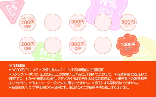 N% PERCENTではポイントカードを発行し、お会計の際に3,000円ごとに応じてスタンプ1個付与。スタンプが1個貯まると200円引き、3個貯まると300円引き、10個貯まると1,000円引きでさらにお得にお買い物いただけます。