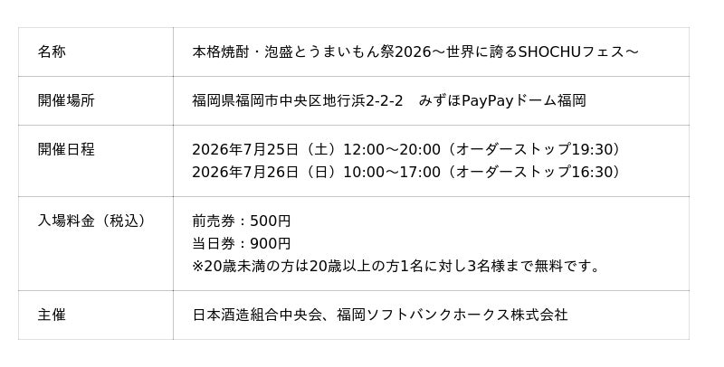 日本が世界に誇る本格焼酎・泡盛とグルメをいっしょに楽しめるイベント「本格焼酎・泡盛とうまいもん祭2026~世界に誇るSHOCHUフェス~」を7月25日(土)・26日(日)にみずほPayPayドーム福岡で開催します。2年ぶりの開催となる本イベントは日本酒造組合中央会と共同で開催し、九州を始め全国各地から蔵元が集結!蔵元自慢の本格焼酎や泡盛を試飲したり、おつまみやお食事とのペアリングを楽しんだりと、さまざまな銘柄が集まるイベントだからこそ焼酎や泡盛の新たな魅力を発見できます!入場券は4月下旬発売予定です!皆さまのご来場をお待ちしております!