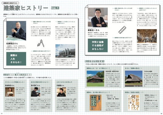 建築士や職人、建築の研究者など、建築のプロへのインタビュー記事を掲載するほか、さまざまな建築の技術や道具も紹介しています。加えて、建築についてさらに深めるための場所や本も取り上げ、子どもたちの興味関心が次の学びへと広がっていく構成としています。