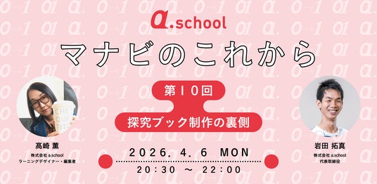 本イベントは、「マナビのこれから」と題したイベントシリーズの第10弾です。a.schoolは12年間にわたり探究学習の普及に取り組んできました。今後も次なる挑戦につなげるべく、多様なステークホルダーとの対話を重ねていきます。