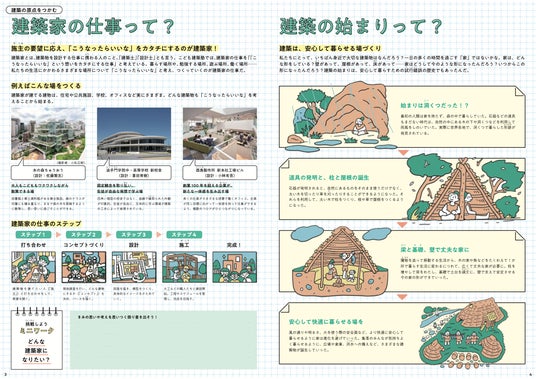 建築士の仕事とはどのようなものなのか、人類はいつから建築物をつくるようになったのか、そして建築は長い歴史の中でどのように変化してきたのか。建築の成り立ちや役割を、原点からたどれる内容となっています。