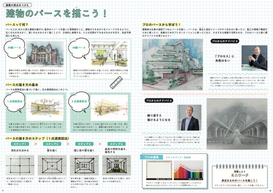 「こんな場所があったらいい」「こんな人のための空間を考えたい」といった発想へつながるよう、建築を自ら構想する立場へと橋渡しする内容も盛り込みました。さらに、パースや図面の描き方、建築模型のつくり方など、建築の世界にふれるための実践的な技術や方法も紹介しています。最終的には、各冊子ごとの探究ミッション(建築提案・模型制作プロジェクト)へとつながる構成になっています。