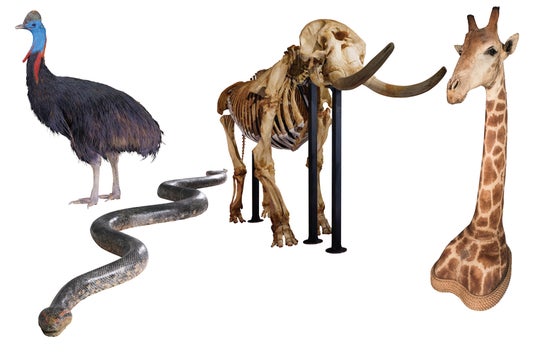【左から】 ヒクイドリ 剥製(我孫子市 鳥の博物館蔵)/オオアナコンダ 剥製(国立科学博物館蔵)/アフリカゾウ 全身骨格(国立科学博物館蔵)/キリン 頭部剥製(国立科学博物館蔵)