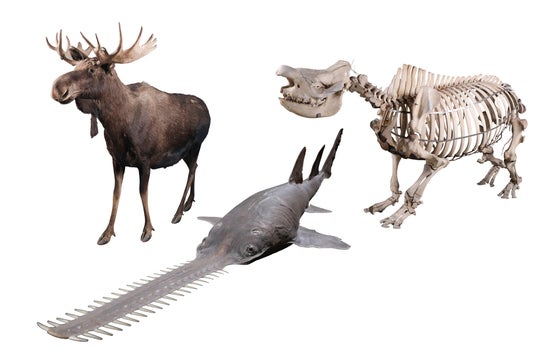【左上】ヘラジカ 剥製(国立科学博物館蔵) 【右上】クロサイ 全身骨格(国立科学博物館蔵) 【下】オオノコギリエイ 剝製(ミュージアムパーク茨城県自然博物館蔵)
