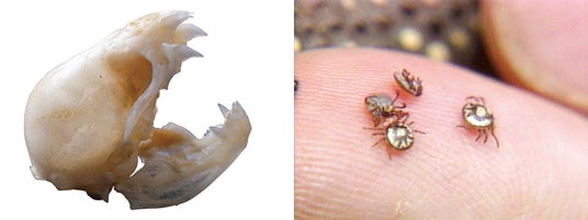 【左】ナミチスイコウモリ 頭骨(国立科学博物館蔵) 【右】マダニ