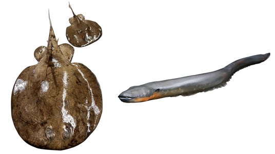 【左】ヤマトシビレエイ 剥製(オガワアート蔵) 【右】デンキウナギ 剥製(国立科学博物館蔵)