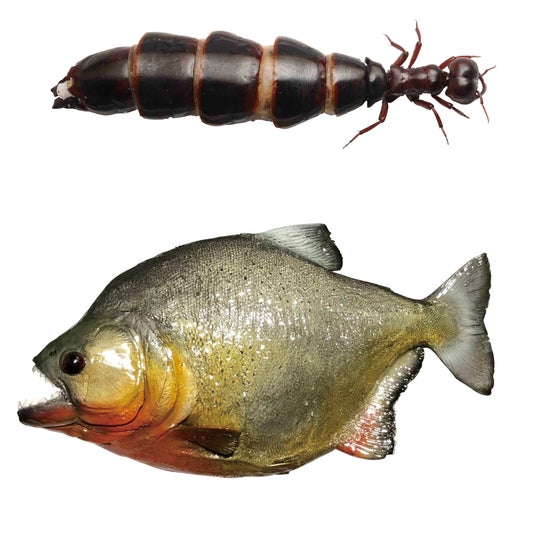 【上】サスライアリ(体長約5cm) 標本(参考生体写真提供:島田拓) 【下】ピラニアナッテリー 剝製(個人蔵)