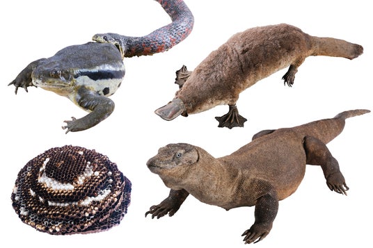 【左上】ヒキガエルを捕食するヤマカガシ 剥製(ミュージアムパーク茨城県自然博物館蔵) 【右上】カモノハシ 剥製(国立科学博物館蔵) 【左下】オオスズメバチ(巣)実物(ミュージアムパーク茨城県自然博物館蔵) 【右下】コモドオオトカゲ 剥製(国立科学博物館蔵)