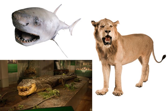 【左上】ホホジロザメ 剥製(ミュージアムパーク茨城県自然博物館蔵) 【左下】イリエワニ 実寸大レプリカ(写真は原標本:フィリピン国立自然史博物館蔵) 【右】ライオン 剥製(国立科学博物館蔵)