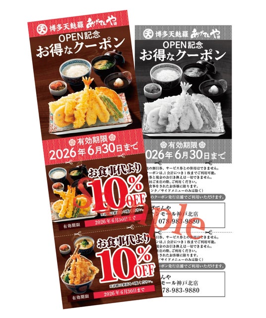 春夏秋冬、季節ごとの旬の素材をサクッと香ばしく揚げた天ぷらが自慢の「あげてんや」ではイオンモール神戸北店を3月26日(木)にグランドオープンいたします。「博多」をコンセプトにした運営スタイルで定食もしくはセットメニューでは「明太子とからし高菜」食べ放題でございます。そして、今回はオープン特別記念プレゼントとして3月26日(木)・27日(金)・28日(土)の3日間限定でご来店先着200名様に卵をプレゼントいたします。また「お得なクーポン券(10%OFF)」をご来店いただきましたお客様に配布いたします。どうぞ、この機会にご利用ください。皆様のご来店をスタッフ一同お待ちしております。何卒よろしくお願い申し上げます。