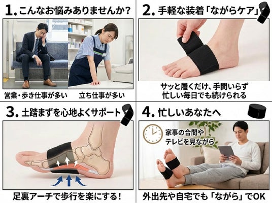 「巻いて立つだけ」で足の裏を心地よく刺激する、これまでにない発想のサポーターが誕生しました。