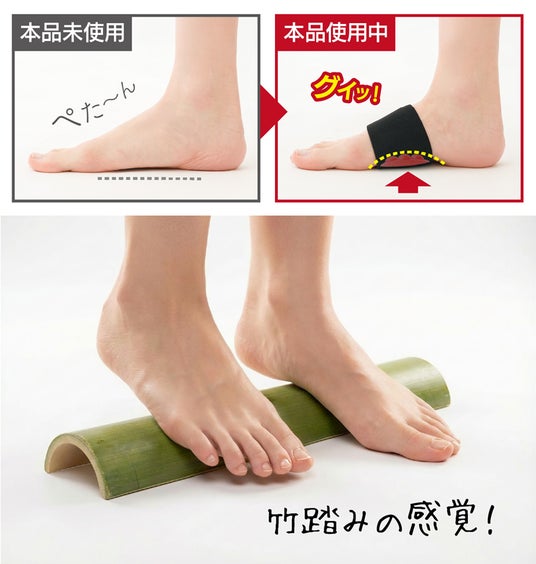 昔ながらの「青竹踏み」は、決まった場所に置いて、そこに足を合わせる必要がありました。このサポーターはその発想をさらに一歩進め、「足に直接巻き付ける」というスタイルにしました。足に固定されているので、動いてもズレることなく、一歩踏み出すたびにアーチ部分が足の裏へピタッと密着します。