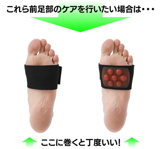 足の指に近い「前の方」に巻くと、親指の付け根付近にある大切な筋肉(母趾内転筋・短母趾屈筋・虫様筋)をしっかりと刺激できます。聞き慣れない名前かもしれませんが、これらは歩くために欠かせない役割を持っています。