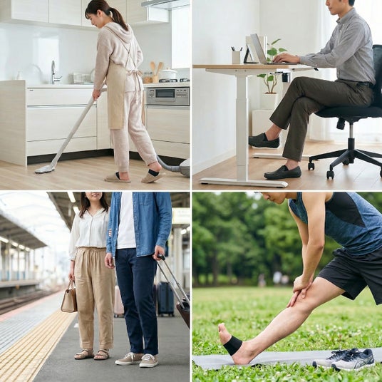 使い方は、とってもシンプル。足の裏に当てて、くるっと巻いて面ファスナーで留めるだけです。お料理や掃除などの家事の間、あるいは職場での立ち仕事中など、いつもの生活リズムを崩さずにそのまま取り入れられます。