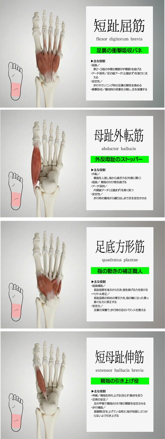 この筋肉は、土踏まずから指の付け根までネットのように広がっています。足の「アーチ」を支えるクッションのような役割をしていて、体重をしっかりと受け止めたり、体がふらつかないようバランスを保ったりしてくれているんです。