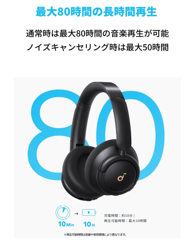 通常使用で最大80時間、ノイズキャンセリング時でも最大50時間の再生が可能です。