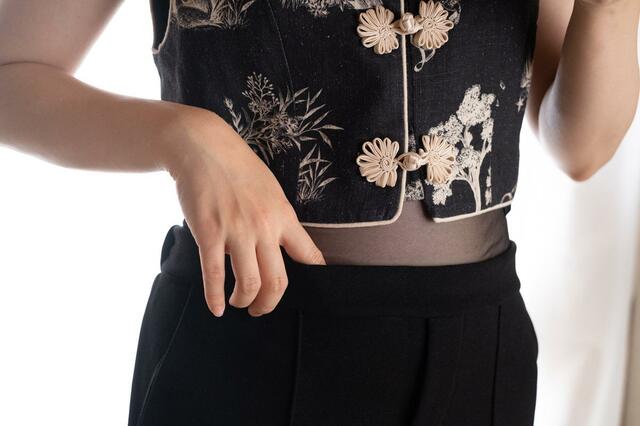 短め丈のトップスとパンツを組み合わせるとちょっとだけお腹が見えることがあるけど、そんな時も安心。